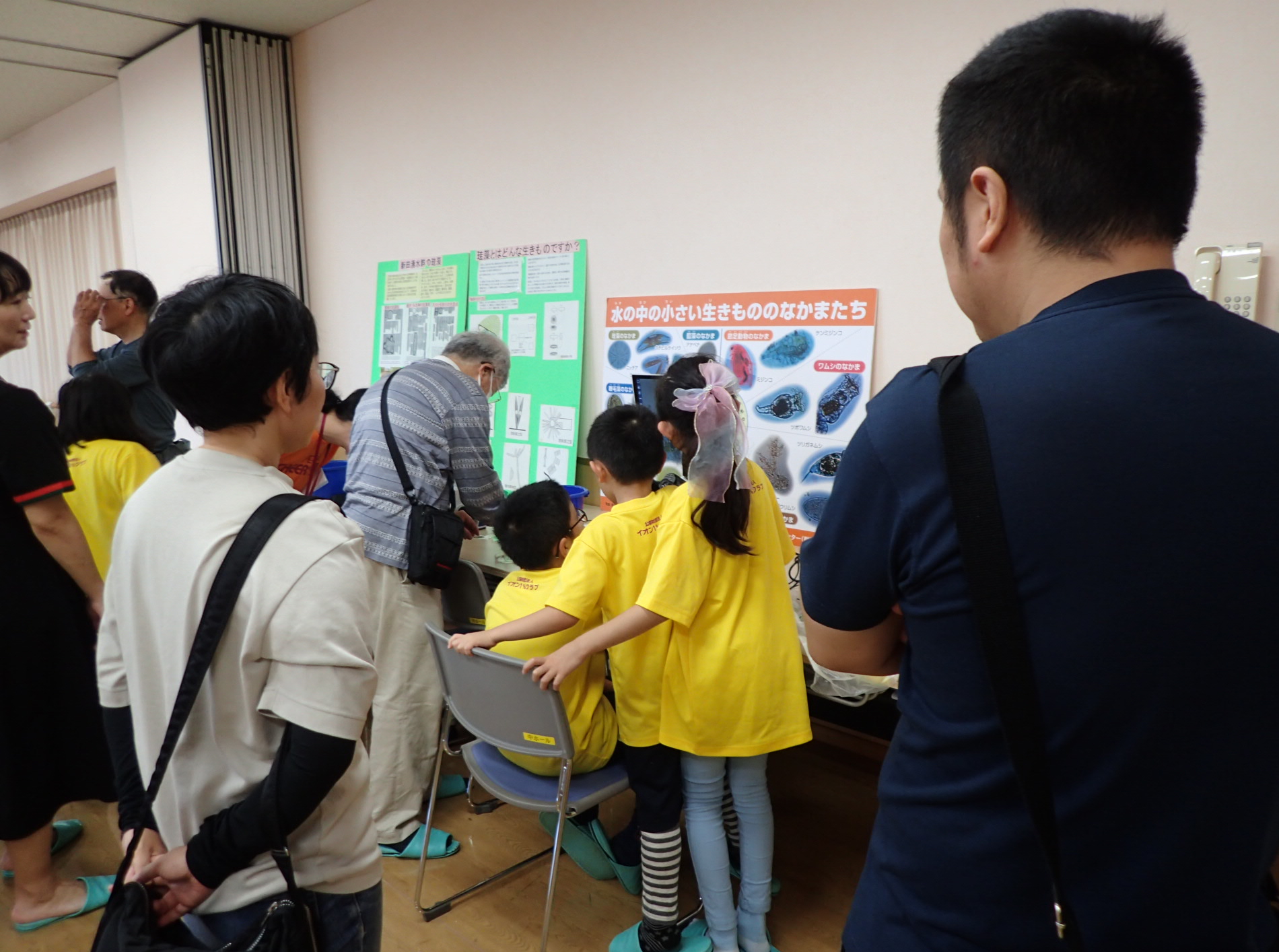 「顕微鏡を用いて水生生物を観察」し、水環境を学ぶ環境学習の様子