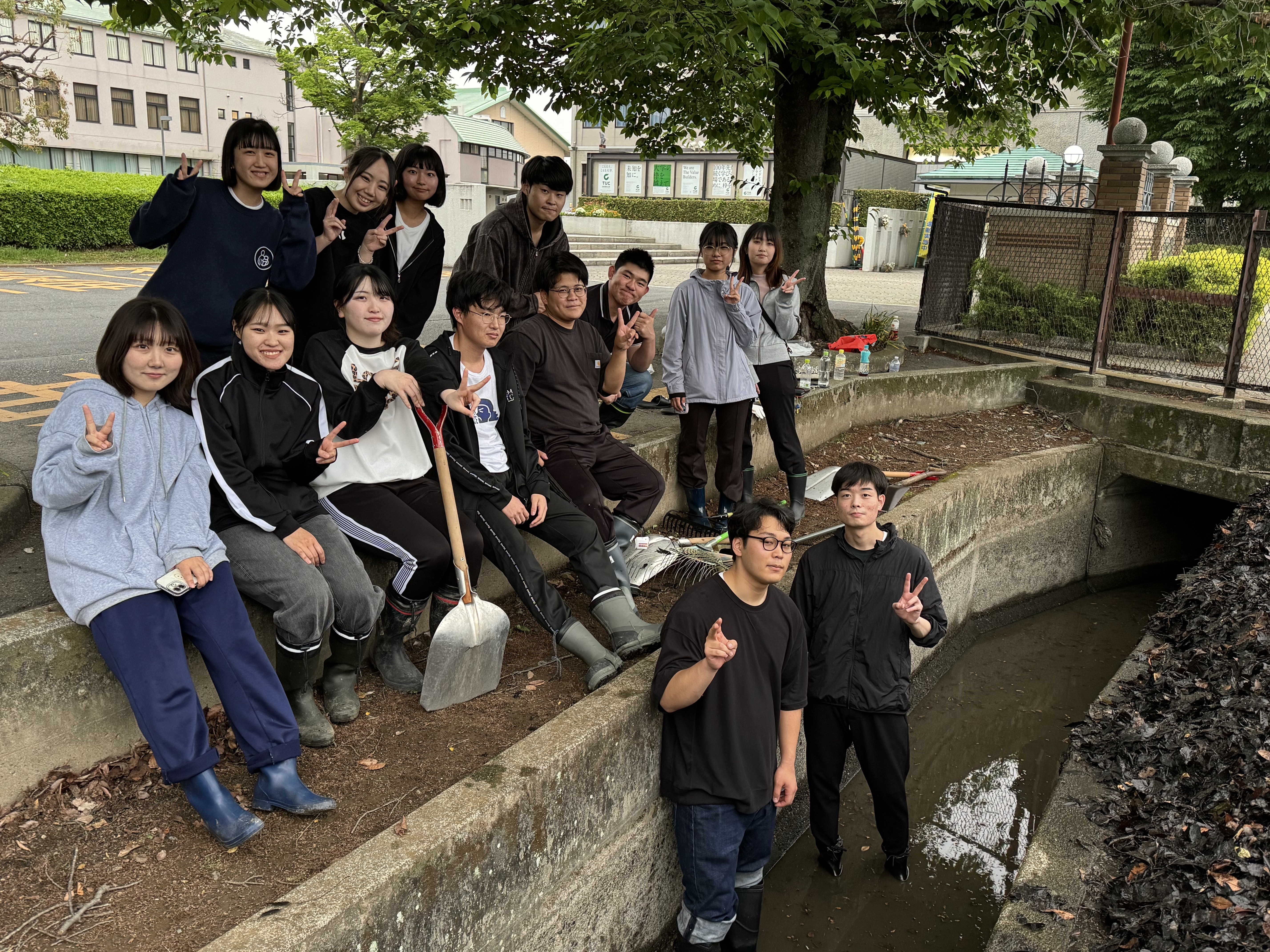 大学前の用水路に溜まった落ち葉を回収して堆肥化し、それを学内外の畑で使い、