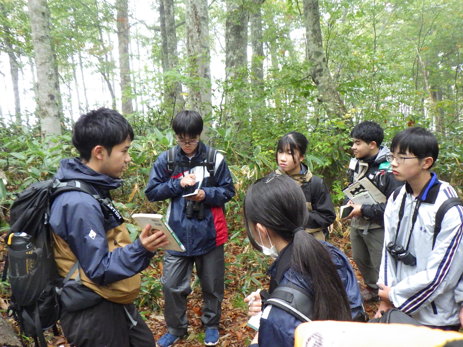 『実際に武尊山「水源の森」ブナ林で自然観察会を行っている様子。左側が尾瀬高3年生、右側は利根中、片品中の2年生』
