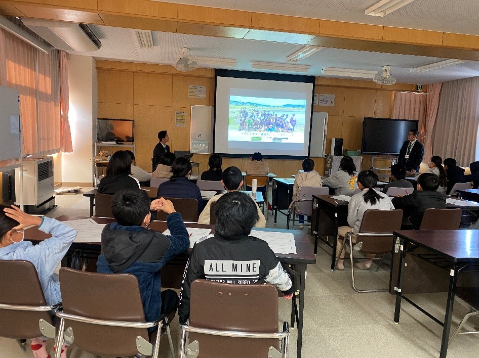 『小学生との最後の交流会「報告会」の写真です。これまでの交流会のまとめを互いに行いました。また、水田の生態系についてもスライドを使って改めて振り返りを行いました。』