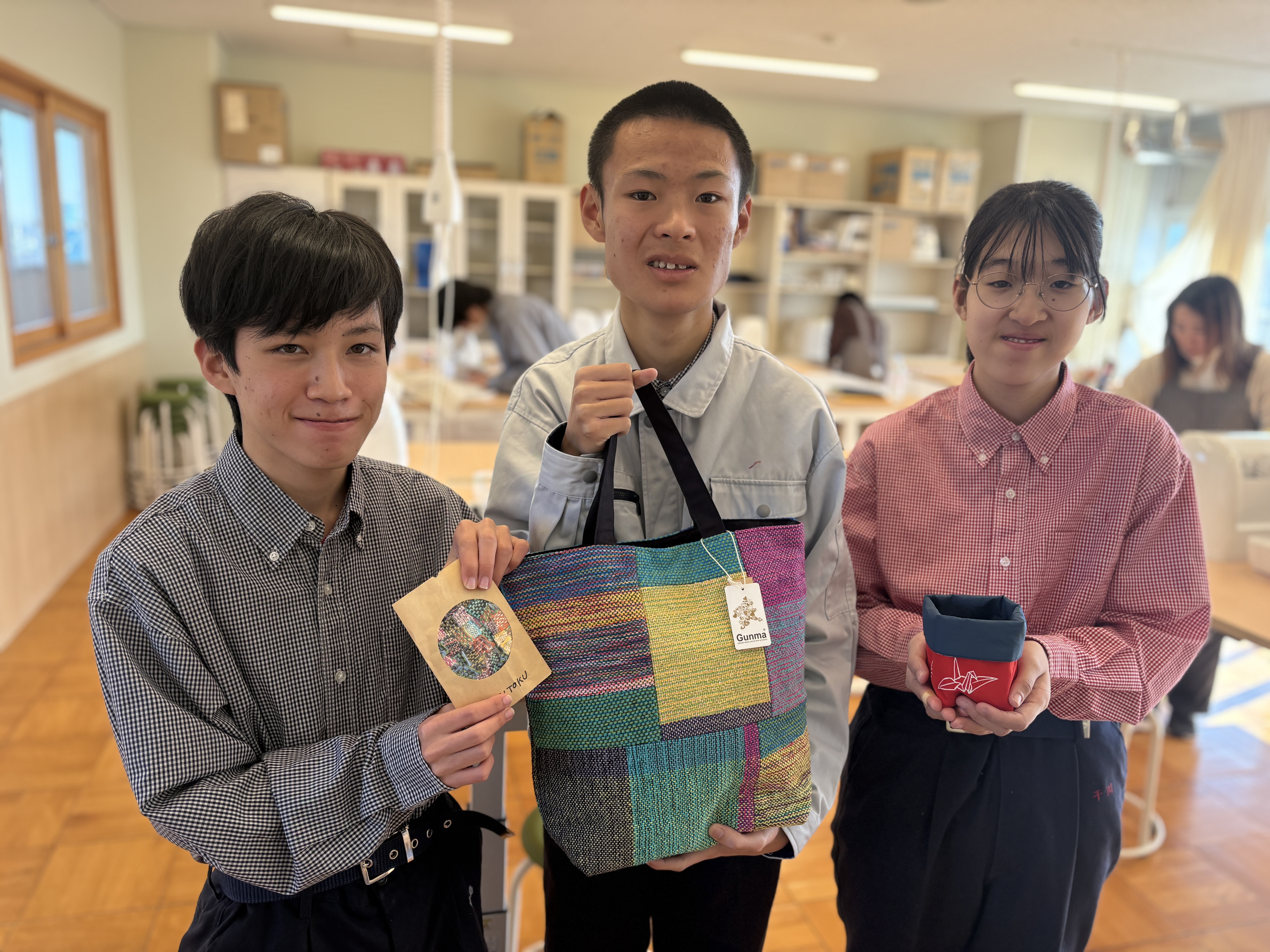 本校高等部の作業学習では、学校所在地である富岡市に根差した絹文化にならい、絹糸を使用した製品づくりに取り組んでいます。生徒たちが手織りで製作した布を用いて製品を作っていますが、製作の過程でどうしても出る端切れをゴミとして無駄にせず、「資源」として有効活用できる製品を開発しています。